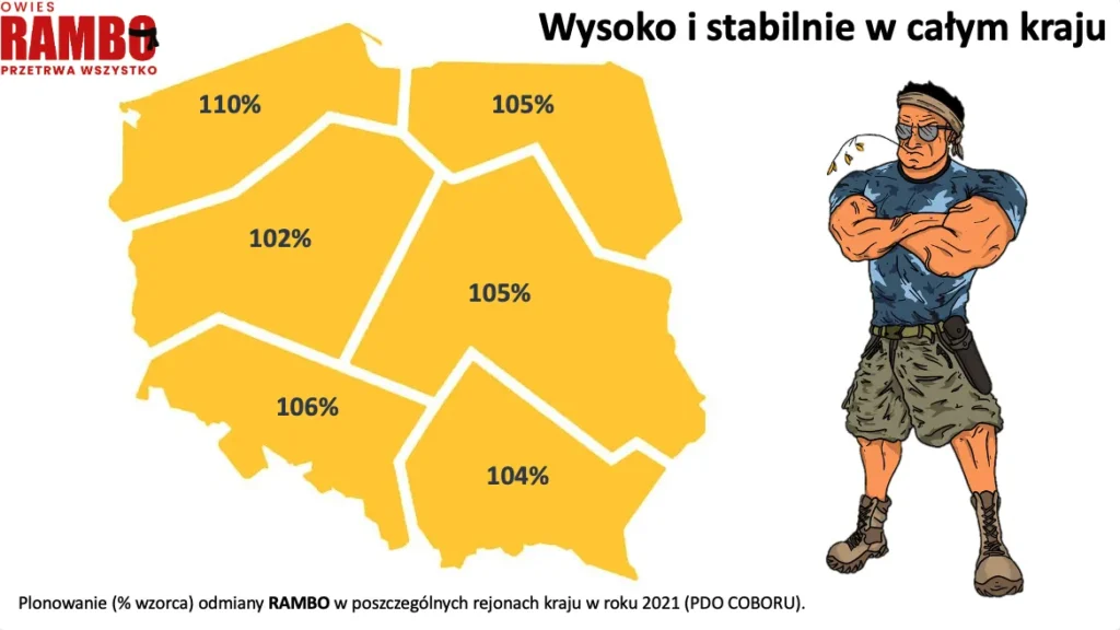 RAMBO to wyjątkowo odporna i niezwykle plenna odmiana owsa zwyczajnego jarego, wyhodowana przez Hodowlę Roślin Strzelce. Odmiana zyskała opinię jednej z najlepiej plonujących w kraju, potwierdzając swój potencjał nawet w warunkach ekstremalnej suszy.